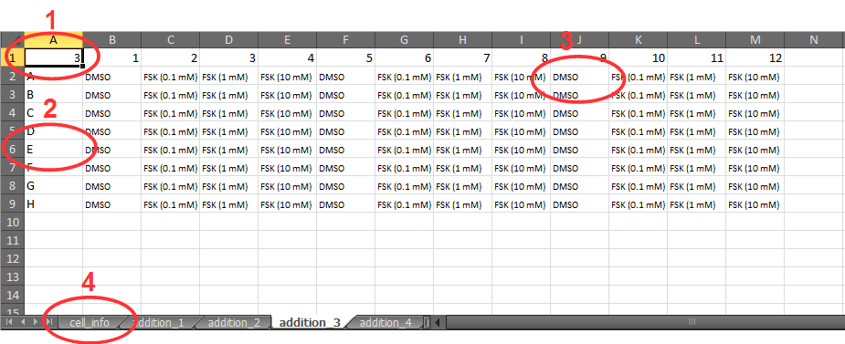 For Single Point measurements different wells with the same treatment can be grouped by providing an additional Excel file (called a label file) with information on the condition applied. The file must contain at least the same number of sheets as the number of additions (blocks) happened during the experiment. Moreover, including additional sheets with grouping information independent from the experiment additions is recommended.